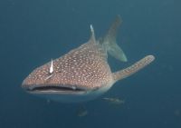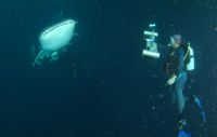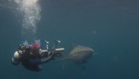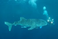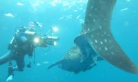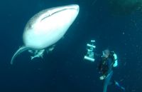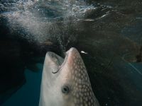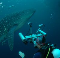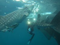 Tauchen ist denkbar einfach. Warten bis der Walhai kommt und fressen will. Die Tiere sind dabei äußerst ruhig und extrem vorsichtig, fast zuvorkommend. Senkrecht schaufeln sich die Planktonfresser, den geschnittenen Fisch der Fischer rein. Spannend, mein Licht hat wohl anziehende Wirkung auf Walhaie. Teilweise sind die Haie um mich rum und haben sich richtiggehend "blenden" lassen. Wir hatten an beiden Tagen bis zu fünf Walhaie gleichzeitig bei den Futterplätzen. Insgesamt konnte ich neun verschiedene Tiere filmen. Beeindruckend war der Besuch von einem rund 9 Meter großen Weibchen, Flügelweite von rund zwei Meter. Die normalen Haie waren zwischen 4 und 6 Meter groß.